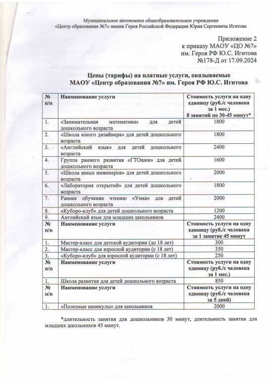 Приложение к приказу №178-Д от 17.09.2024 Перечень платных образовательных услуг